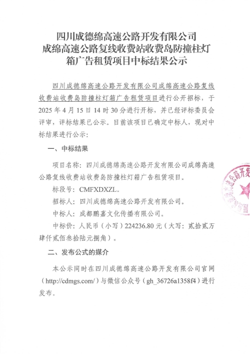 四川成德绵高速公路开发有限公司成绵高速公路复线收费站收费岛防撞柱灯箱广告租赁项目中标结果公示