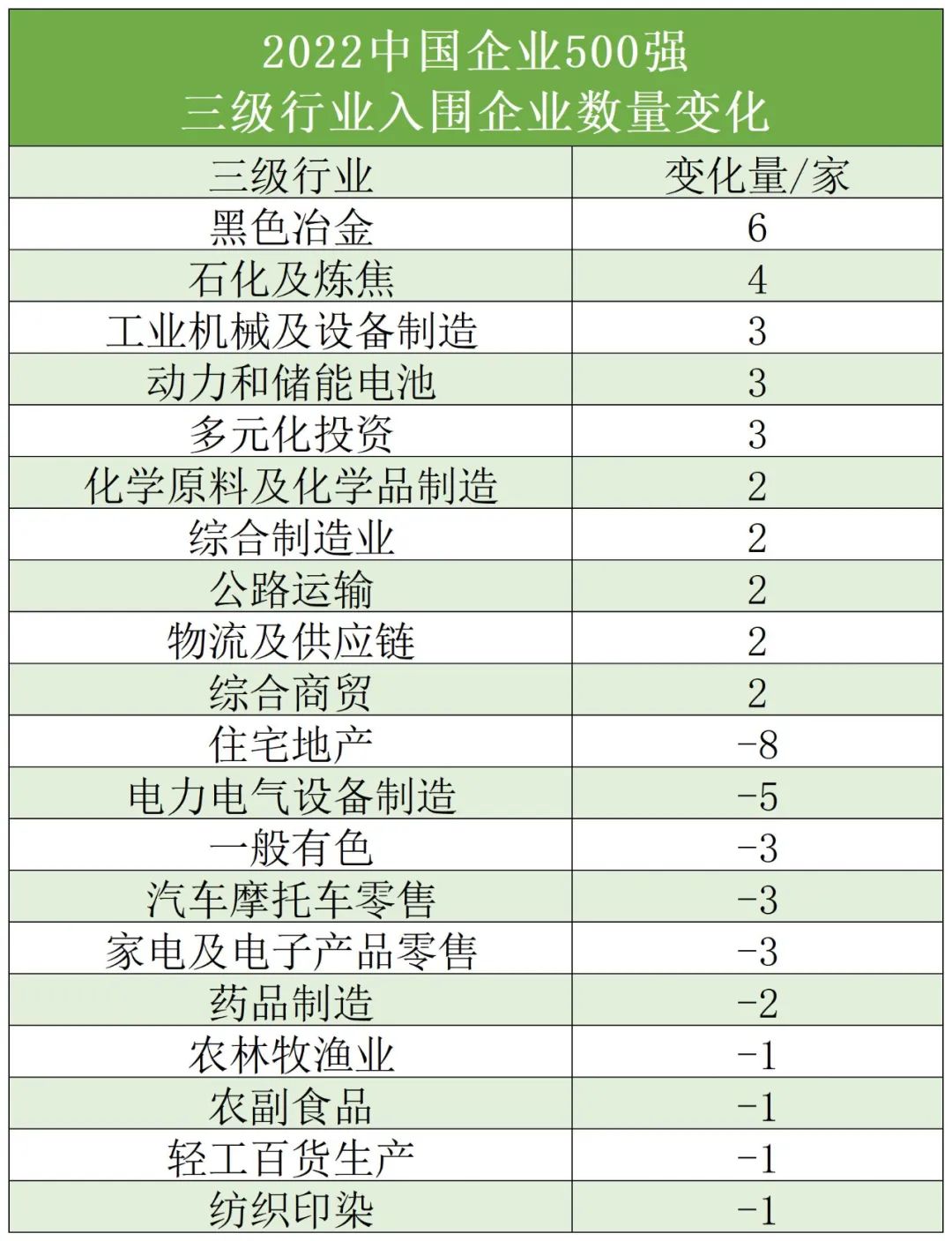 2022中国企业500强中,一些行业入围企业数量出现较大变化,反映了500强的行业结构在经济复苏进程中在持续调整。黑色冶金行业迎来较快恢复,入围企业净增6家,居行业首位;石化及炼焦净增4家,工业机械及设备制造业、动力和储能电池业、多元化投资业均净增3家,化学原料及化学品制造业净增2家,计算机及办公设备业净增2家。生产性服务业整体复苏较好,公路运输、物流及供应链、综合商贸3个行业均净增加2家。