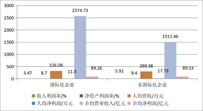 不过,国际化企业的盈利能力持续低于非国际化经营企业,这一局面已经延续多年。2022中国企业500强中的国际化经营企业,其收入利润率、净资产利润率均低于非国际化经营企业,人均净利润、企均净利润也低于非国际化经营企业。2022中国企业500强中,254家国际化经营企业的收入利润率为3.47%,低于非国际化经营企业2.45个百分点;净资产利润率为8.70%,低于非国际化经营企业0.70个百分点;人均净利润为11.30万元,比非国际化经营企业低6.43万元;企均净利润为89.26亿元,比非国际化经营企业低0.27亿元。