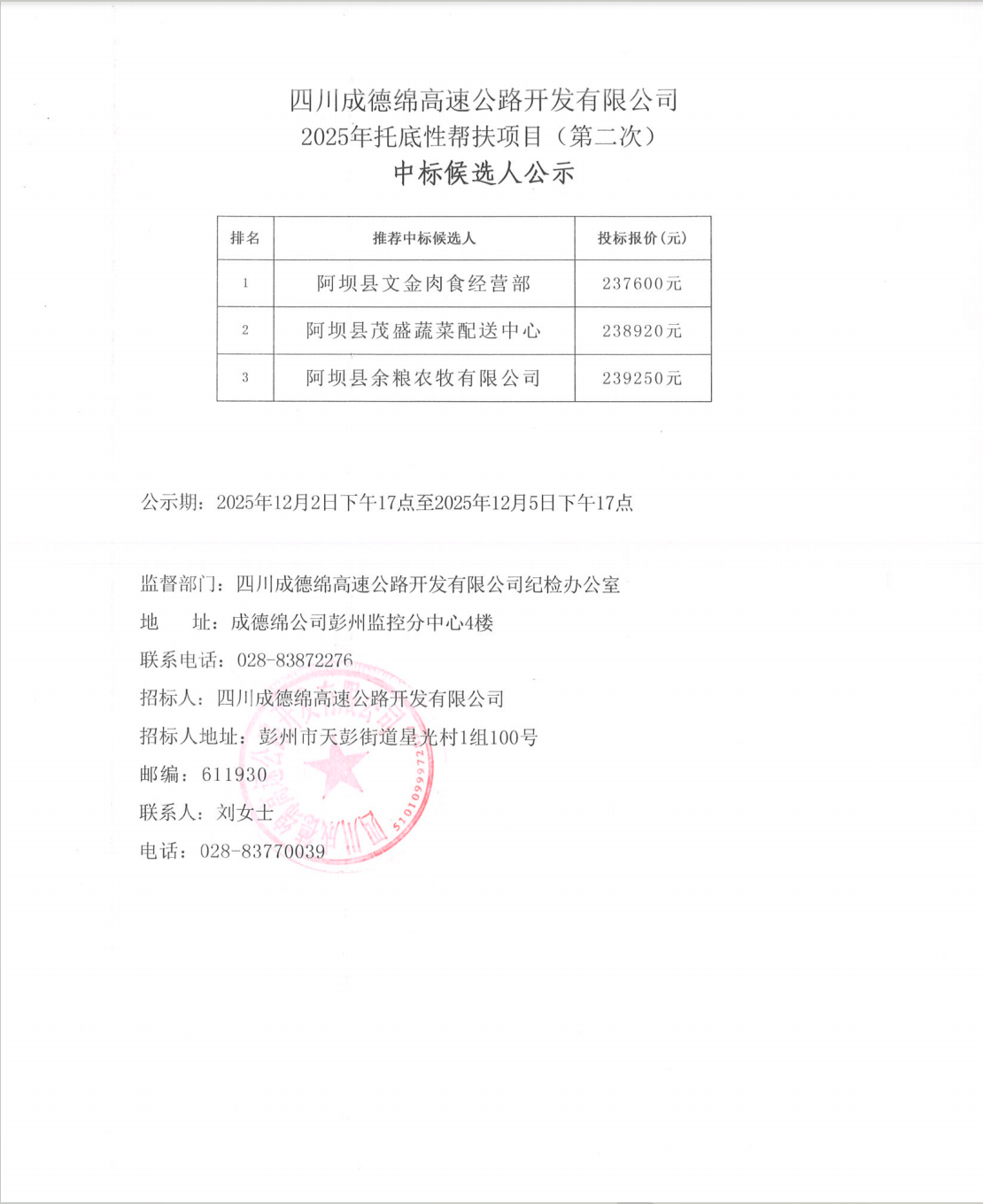 四川成德绵高速公路开发有限公司 2025年托底性帮扶项目(第二次) 中标候选人公示
